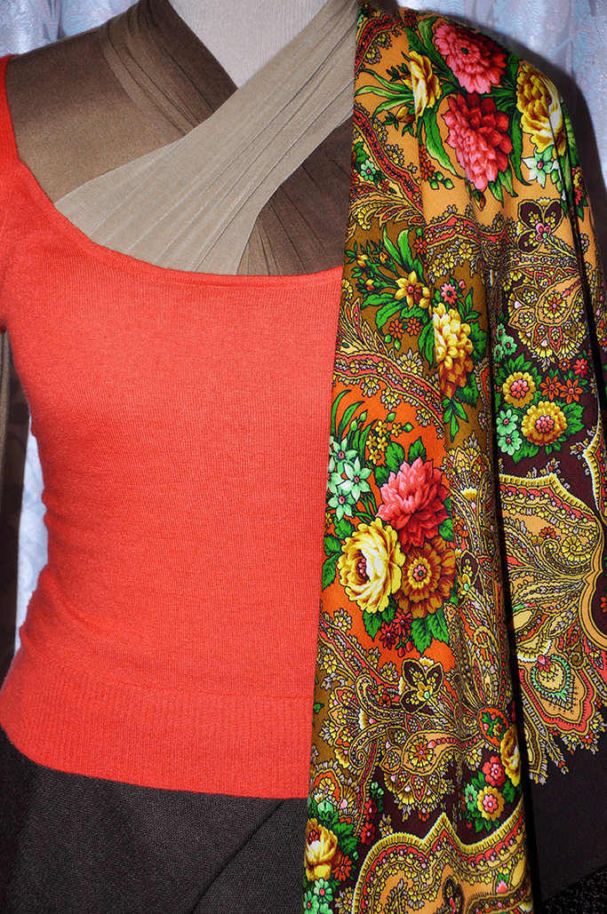 А главный герой моего сегодняшнего показа - золотой Миндаль! Когда я получила эту шаль, восторгу моему просто не было предела - он подошел к большинству моей одежды. В нем присутствуют все самые мои любимые цвета! Те варианты, которые я вам сейчас покажу, - лишь малая часть от всех возможных