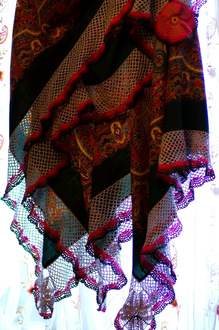 С Ожиданием немного трепещу, т.к. тут уже не скромная обвязка, а почти самостоятельное изделие (и ниток-то ушло в 8 раз больше). Захотелось чего-то эдакого...испанского...объемного. Хотя идея и очень близка к предыдущей (это на следующий платок у меня запасена новая совсем мысль, эх! времни бы еще хоть чуточку побольше!) Получилось или нет