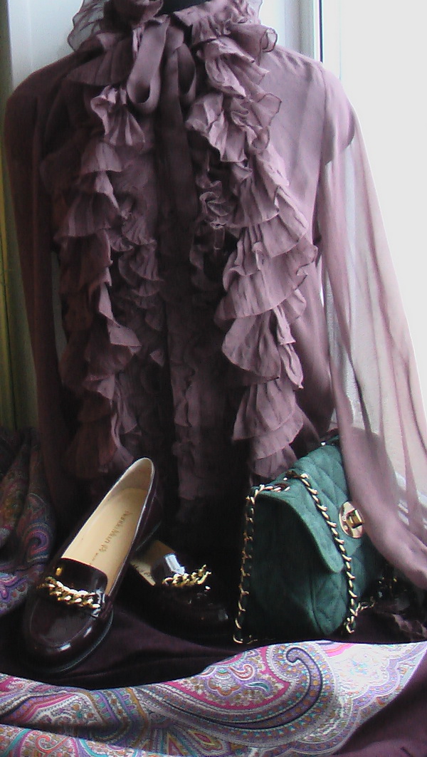 С велюровыми брюками и шёлковой блузкой шаль вряд ли буду носить, думаю пока. Ещё не примеряла, но по цвету с туфлями неплохо. А вообще хочется конечно максимально повсюду добавлять шали, во-первых у меня их много и меня они радуют. :) Но я сама люблю простоту кроя и натуральные ткани, очень люблю и ношу вещи RL всё мне у него нравится.