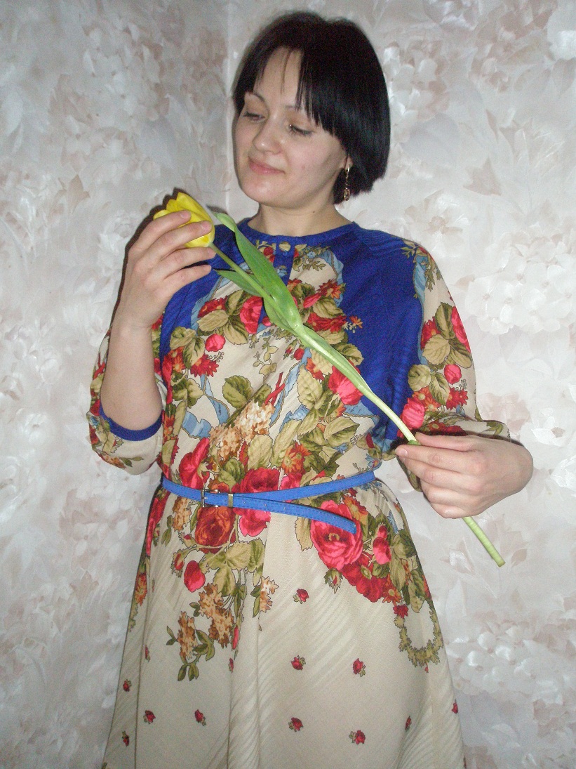 Представляю вниманию форумчанок платье, сшитое из одного платка "Свадебные ленты". На фото - моя невестка Наташа (размер модели приблизительно 46(верх) 48 (низ)). Пуговицы для платья обтянуты в ателье обрезками от платка. Можно носить с пояском и без него. Фотографии можно увеличить.