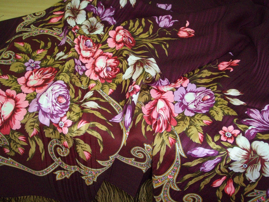 Фотографии со вспышкой добавляют платку желтизны, Основной ориентир - самое первое фото (общий вид платка), но, к сожалению всей яркости роз и оно не передаёт.