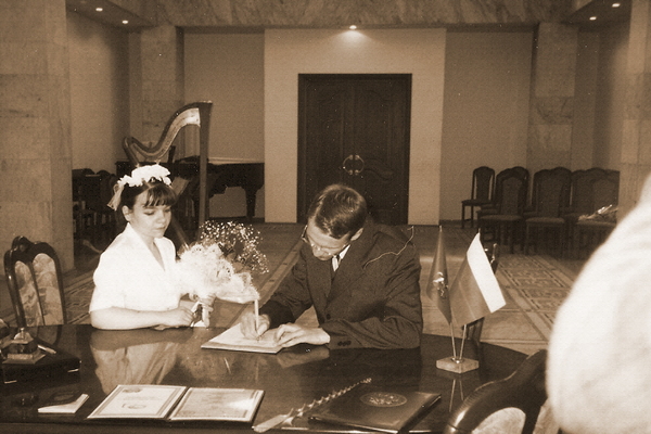 Нашла отсканированную свадебную фотографию. Она искуственно состарена, кажется, что дело происходило в 70-х годах, а на самом деле гораздо позднее.
