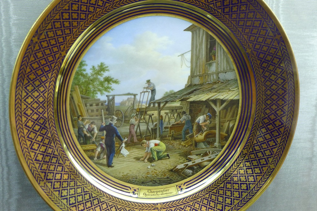 Ну и, само собой, увековечили в фарфоре родное предприятие. На тарелках - Севрская фарфоровая мануфактура, обжиг в муфельных печах, на 2-м фото - глазурование и еще какой-то процесс, перевести не удалось.