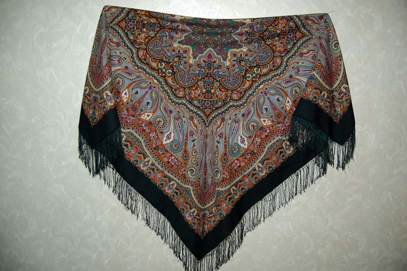 Мне мама отдала свой платок, который у нее уже много лет. Я не уверена, что это изделие павловопосадской мануфактуры, но может быть...? Бахрома шерстяная и очень уж похожа на павловопосадскую по способу крепления.