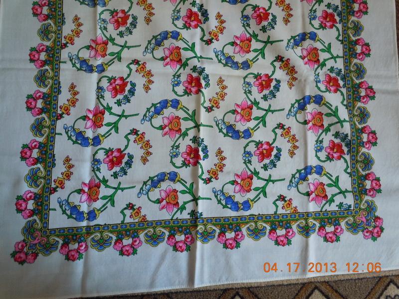 Платок 70*70 с розами и гвоздиками, похоже что шерсть. У нас в архиве не нашла, может просто не заметила.