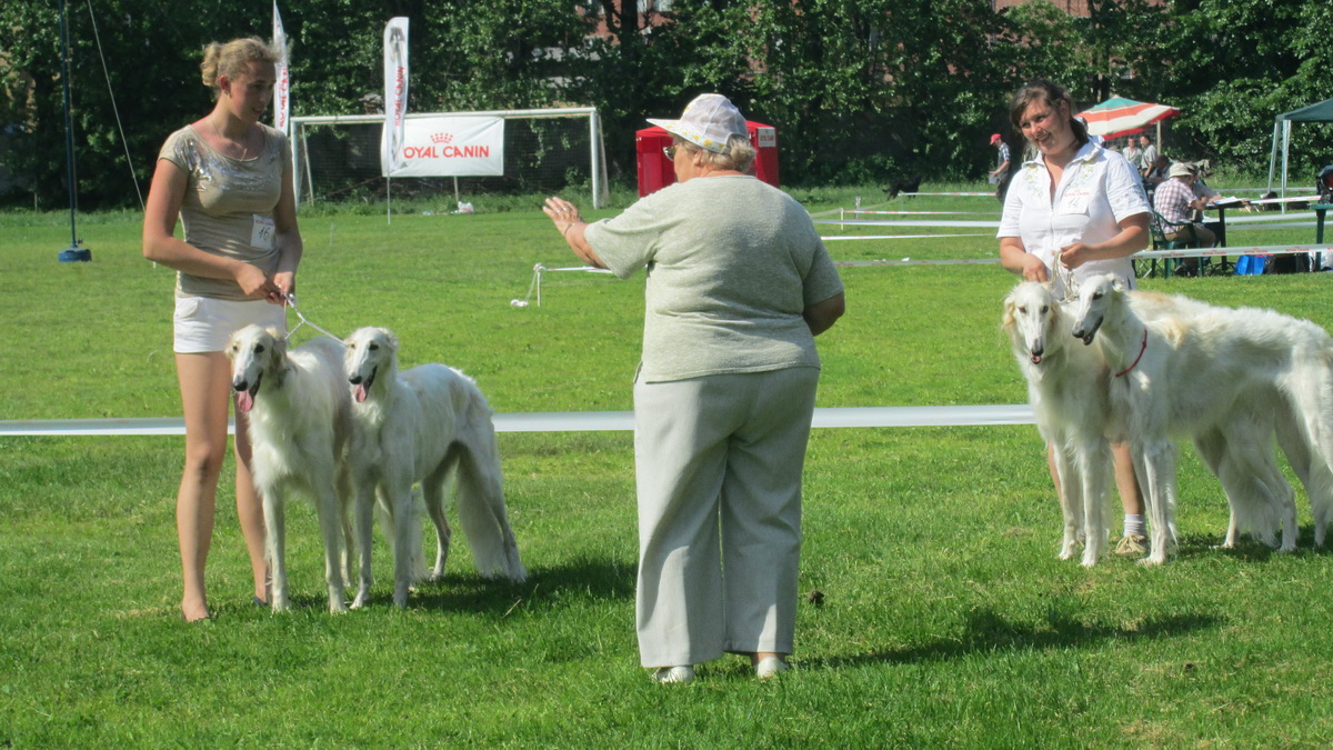 Леда сегодня тоже ванну принимала. Утром её с головы до хвоста обмусолил и извалял в песке её приятель лабродор, а завтра на две выставки. Хорошо, что жарко, после ванны сразу на улицу, не надо с феном возится, ветерок прекрасно укладочку делает