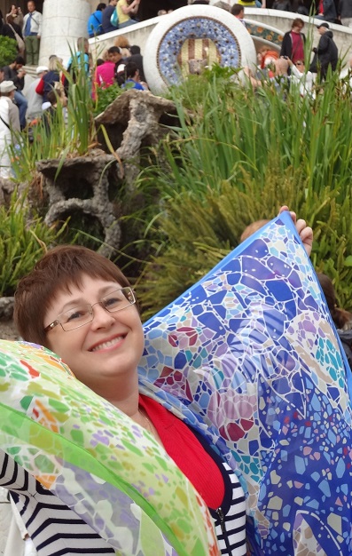Платок "Парк Гуэль" же - в самОм Парке Гуэль - как родной! :: - туристов - не просто много - а огромные стадА, полчища и тОлпы...Сфотографировать платок "без меня" не было просто никакой возможности (к тому же - ветер был..) - пусть будет - "с радостной туристкой из России" (опять же - подходит для темы - "Скамеечная" - пара фотографий как раз на скамейке) НО!!!! - слышали, как "наблюдатели со стороны" (иностранного происхождения) - отмечали "прямое родство" платков и фрагментов скамьи!