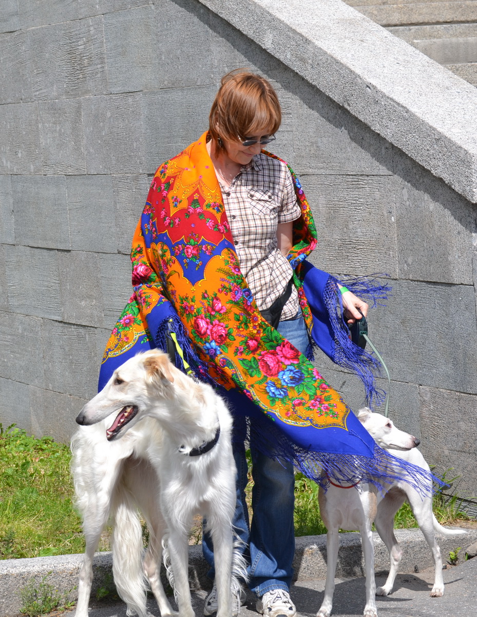 Ника также прихватила с собой саржевый САНКТ-Петербург (только сейчас я поняла, с чем ассоциируется у меня общий тон этого платка. Когда мы вышли на улицу, над городом висела огромная стальная грозовая туча, занимавшая всё небо. Но один луч солнца всё же сумел через неё пробиться. Ненадолго.)