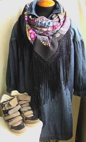Дымчато-серое платье очаровательно само по себе...без шали точно. С туфельками этими очень кокетливо получается....Если их заменить на роковую шпильку, то образ будет другим...но тоже платок не нужен. Максимум тяжелый шелковый палантин близкий по тону к платью :Q .