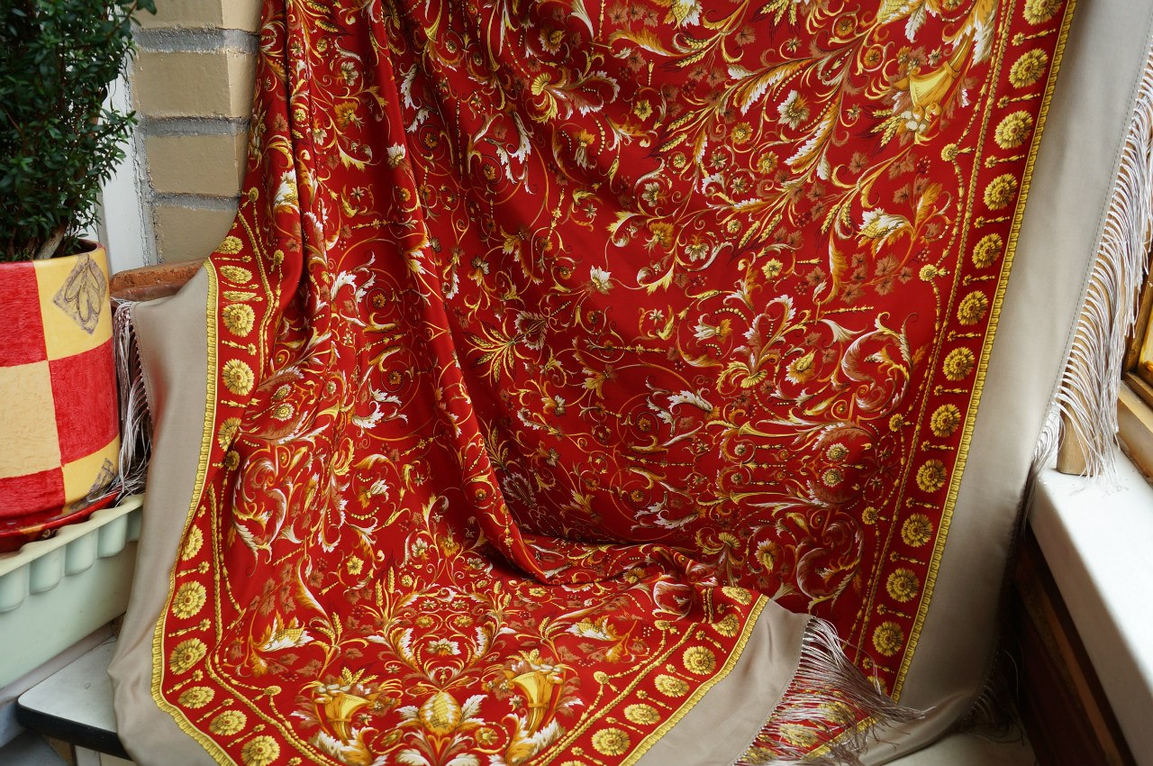 Эх, сколько лет ходила я кругами около красной Песни ветра..... и не выдержала. Потянуло неудержимо на красненькое. Выбирала долго, надоела всем и однажды утром восстала ото сна с отчётливым решением, что это случится именно сегодня! Короче, вчера мы с красной Песней обрели друг друга. Выбирала из двух экземпляров, случайно заметив, что они совершенно разные! Кайма и бахрома отличались по тональности, белое на выбранном экземпляре было ярче, а уж когда заметила, что и красный фон более насыщенный, то на этом выбор закончился. Хоть и много её в базе, но показать хочется.