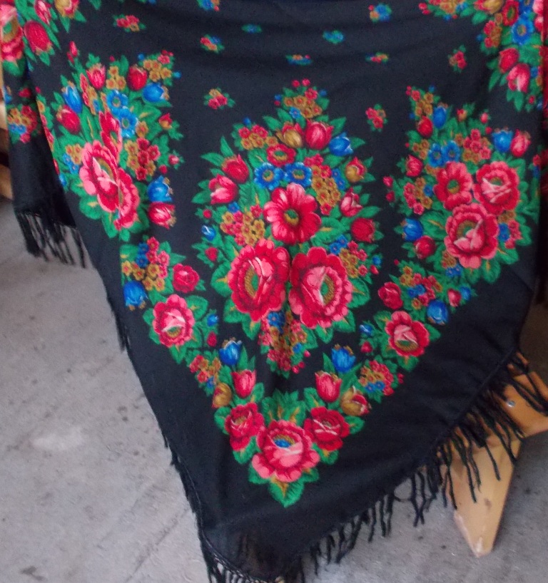 Сама не могу...интернет плохой. Сняла с дамы на свадьбе, сфотографировала...Был подарен ей на свадьбу 25 лет назад. на вид 146*146, шерстяная бахрома.