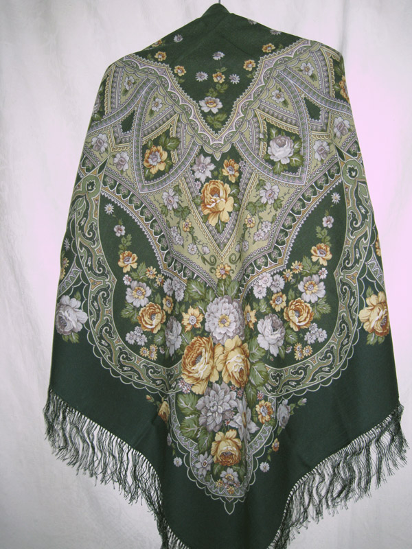 Зеленых платков у меня почти нет, только "Садко" и "Абстракция", но я давно посматривалва на "Праздник Покрова" и наконец его приобрела" Кайма платка очень красивого, благородного, глубокого темно-зеленого цвета