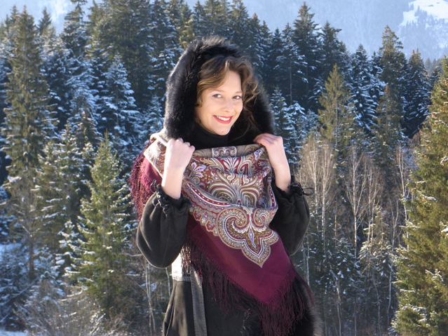 Я за 2 фото. Морозные узоры на платке перекликаются с голубоватым снежком на елях, тонкие нежные стволы березок и нежность, белизна и тонкость ваших рук, фото завораживает и зачаровывает. Меня фон не отвлекает, а только помогает проникнуться красотой платка, гармоничностью узора и вашей красотой. По настроению 2 фото живее, лицо выраженнее и цвет платка настоящий и фото настоящее, его интереснее рассматривать и даже кажется, что глаза лукавее...