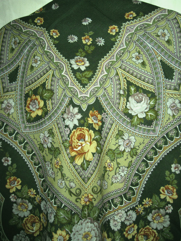 Зеленых платков у меня почти нет, только "Садко" и "Абстракция", но я давно посматривалва на "Праздник Покрова" и наконец его приобрела" Кайма платка очень красивого, благородного, глубокого темно-зеленого цвета