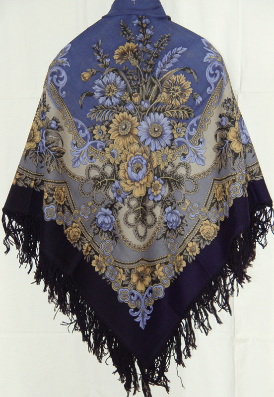 Кайма холодного темно синего цвета. Рисунок очень мелкий, тщательно прорисованный. Платок производит впечатление довольно темного возможно из-за каймы, хотя в рисунке есть белый и светло-голубой. Думаю, при солнечном освещении рисунок должен заиграть своими самоцветами. Хотела его подарить, но пока решила оставить. Летом и весной с чем-нибудь джинсовым должно быть неплохо.