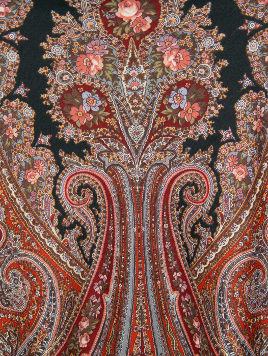 Очень красивый, благородный платок, не яркий, общий тон розово-красный с серо-голубым. Сложный узор с множеством мелких деталей. Хотя красного много, он не преобладает, скорее оттенки розового, а голубой все это смягчает. Один из моих самых любимых.