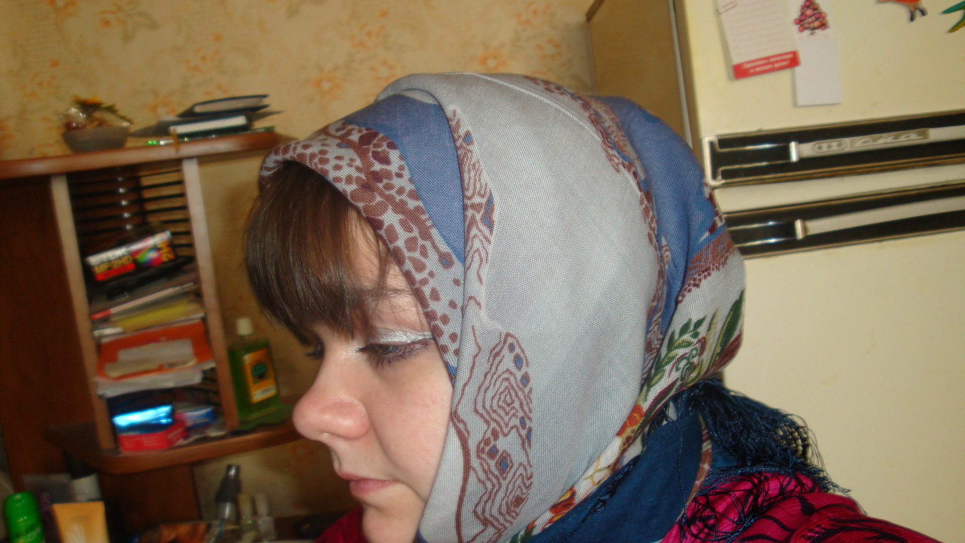 Часто ношу платки на голове,вот посоветовали немного иначе укладывать платок на голову,вариант немного старомодный.