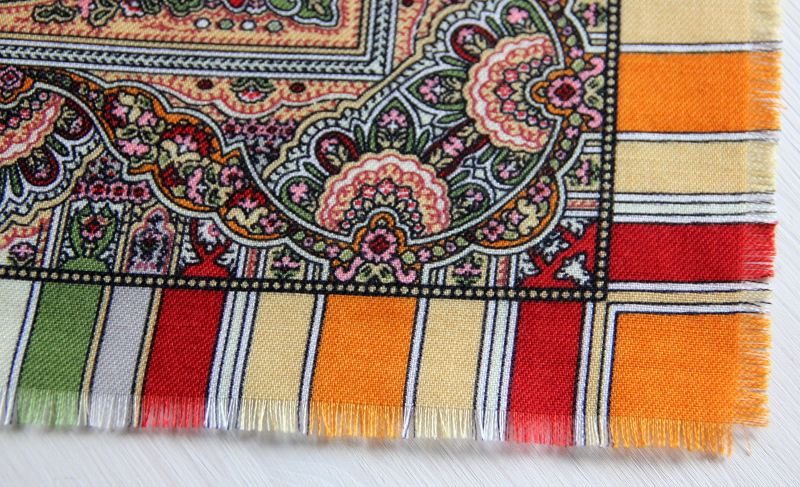 В общем, проверила я расположение рисунка по одной стороне платка, и пошла пороть оверлок... Но каким-то непостижимым образом 2 стороны оказались ровными (ну или почти), а две другие- со значительным перекосом.