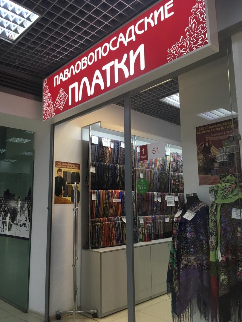 Действительно есть фирменный магазин Павловопосадские платки в ТК на 1 этаже 51 павильон в г. Иркутске. Не поверите, специально съездила за 350 км посмотреть на него воочию. Первое впечатление хорошее. Продавщица милая, собиралась покинуть рабочее место, но выслушав нас -открыла павильон. Глаза разбежались от обилия продукции. Взгляд выхватил Богатых невест, Счастливиц, Ненаглядных и даже 19 Сиреневый туман в свободной продаже. Цены демократичные, но с сайтом немного расходятся. Богатые невесты 4020 руб, Ненаглядные 4540 руб.Вспомнила Каффу с её намоткой красной прекрасной Матрёшки,примерила на себя сего малыша, угадала в цвет пальто идеально, как единое целое, но вот яркая зелень листочков остановила восторг и заставила сомневаться -правильно ли? За то нашлись сразу две скатерти В гостях у сказки, мои мечтовые, купила обе, а за одно и Тихую охоту в красном, праздничном колорите по распродажной цене - 800 руб.На мой вопрос как идут продажи, продавец сказала, что в основном покупают на подарки. Привоза не было ещё в 2019 году, только то, что привозили перед Новым годом. Уже порядком отъехав от сего сказочного места, сообразила , что не сделала ни единого фото, но убедила себя в том, что в ближайшие пару месяцев съезжу ещё раз. В целом впечатление и от магазина и от покупок-хорошее, товара достаточно, он обозреваем,доступен для внимательного разглядывания, вывески товар руками не трогать нет.Продавец вежливо предупреждает об этом и охотно снимает с витрины для примерки. Спасибо ППМ за осуществление моей мечты! ::