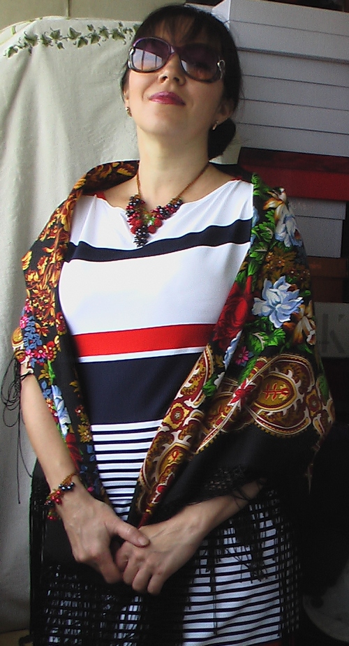 Сочетание разных оттенков белого редко хорошо смотрится. На платье полоски белоснежные, поэтому кремовый фон или орнамент платка будтет рядом казаться несвежим.