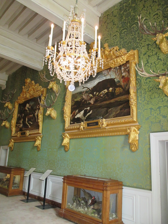 На первом этаже - всё в "стиле королевской охоты" - позолота, картины со сценами охоты, чучела голов-рогов животных...
