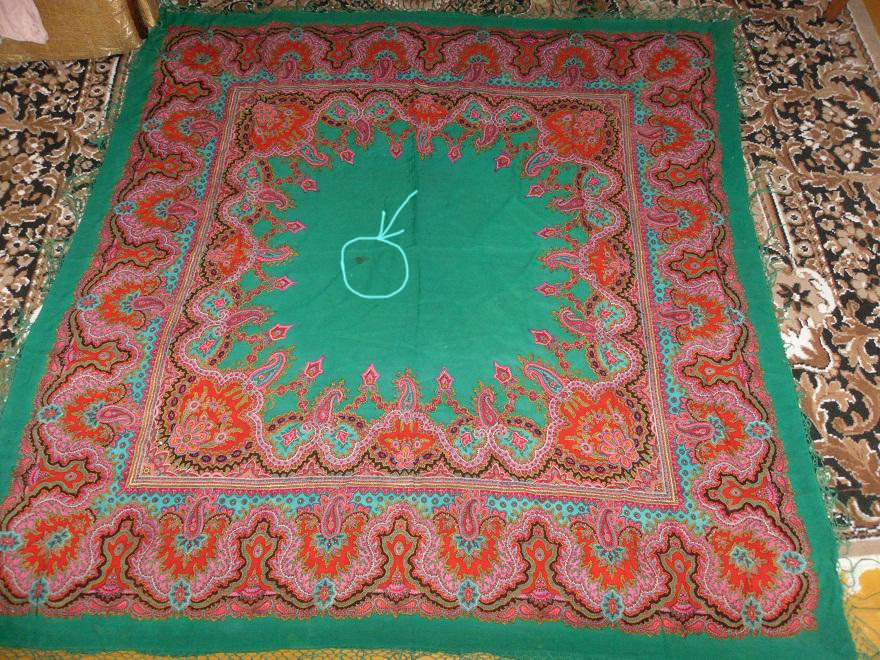 В объявлении имелось в виду следующее - всё на фото, дырки от моли и зашитое место показал. 165х165 см- очевидно размер шали, наверное с кистями.
