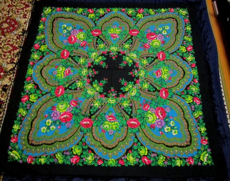 недавно попалось обьявление с продажей платка , 150см на 150 без бахромы, а сама бахрома кажется с просновками, куплен в России, но других деталей нет... :?
