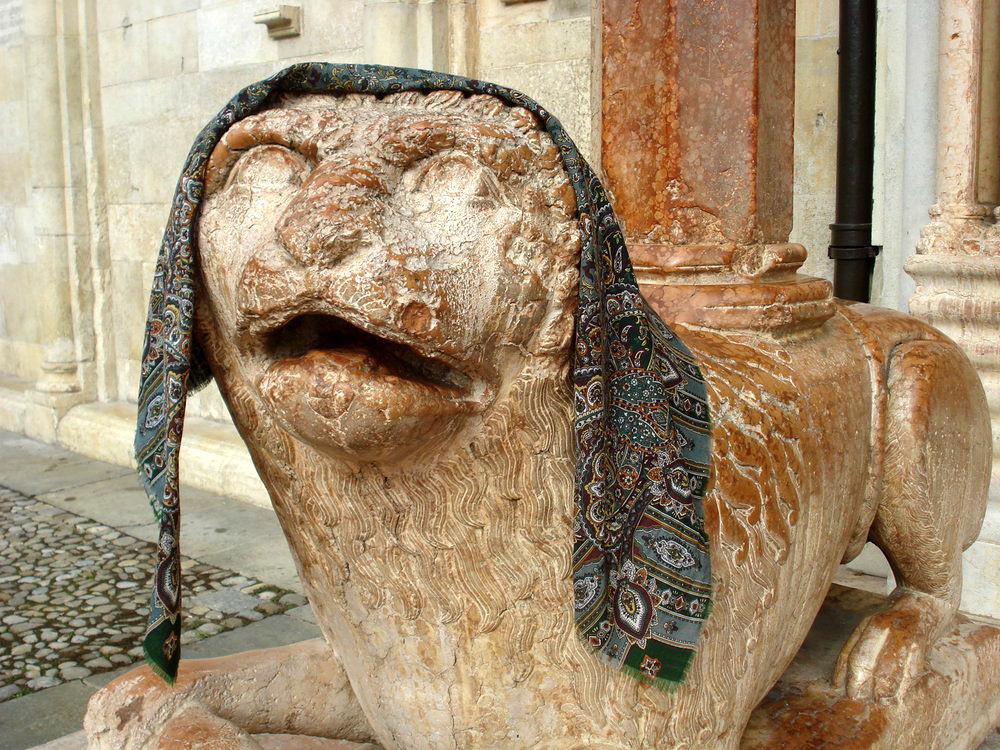 А я, когда бываю в Италии, как-то про платки забываю, даже про итальянские.Получилось какое-то совсем кулинарное путешествие и покупки соответственные. Объездила с десяток городов с Садко, а вспомнила о нем только в Модене, куда поехали настоящий бальзамический уксус купить многолетней выдержки. Фото с платком получились совсем бездарные, но хотела хоть такие показать, что же он совсем зря ездил. Это портал собора, со всем сторон украшенного львами