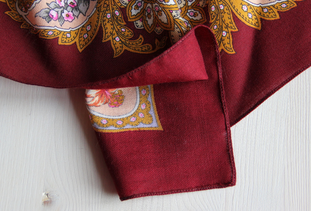Меня интересовало, как смотрится платок с отрезанной каймой, а не каким способом он подшит, ну да ладно.