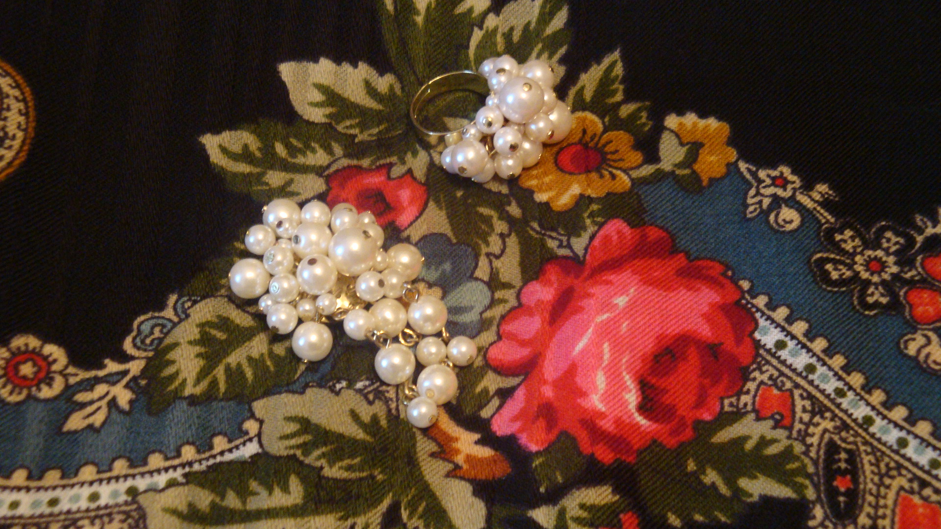 Брошка из крупных белых бусин с кольцом в комплекте.