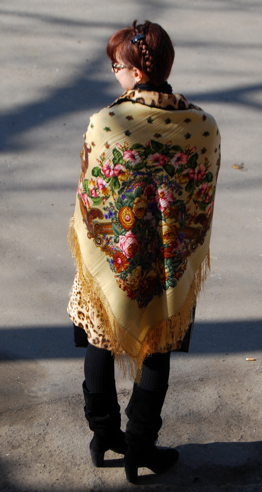 Ника, я порылась в своих фотографиях и откопала таки две со спины. Правда, на мой взгляд, фотографии плохо получились, но я покажу их - вдруг Вам пригодится (в оценке платка). Я очень жалею, что не приобрела такой колорит ^V^ (но все платки ведь сразу не купишь, а он был такой один на весь город). И он совершенно не бледнит, поскольку ,действительно ,отливает золотом.