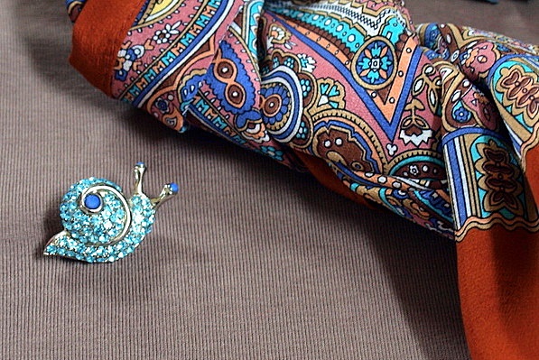 Покупаю иногда, потому что не могу устоять перед красотой, но практически не ношу. И с платками не носила, только декоративные булавки, вот они у меня в ходу. Если интересно, выгребу свои запасы, они у меня старые, новые брошки давно не покупала, попытаюсь подобрать платки и показать.