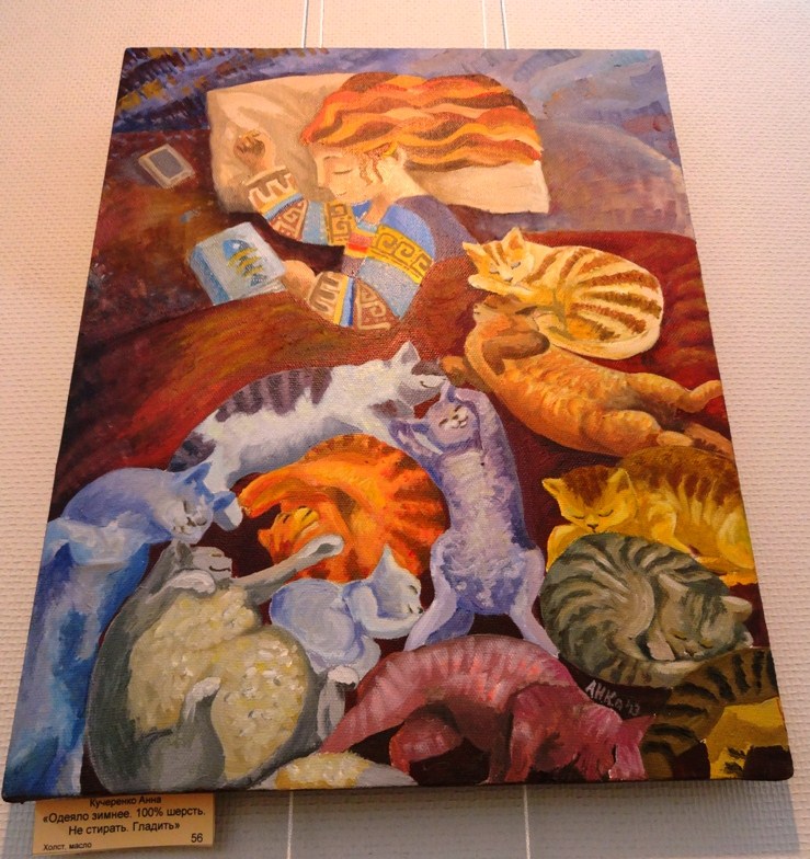 Сегодня была на выставке "Вертикаль" (живопись, графика, декоративно-прикладное творчество молодых художников). Увидела там картину Кучеровой Анны "Одеяло зимнее 100% шерсть. Не стирать, Гладить" и вспомнила о теме "Зоо-арт" на форуме.