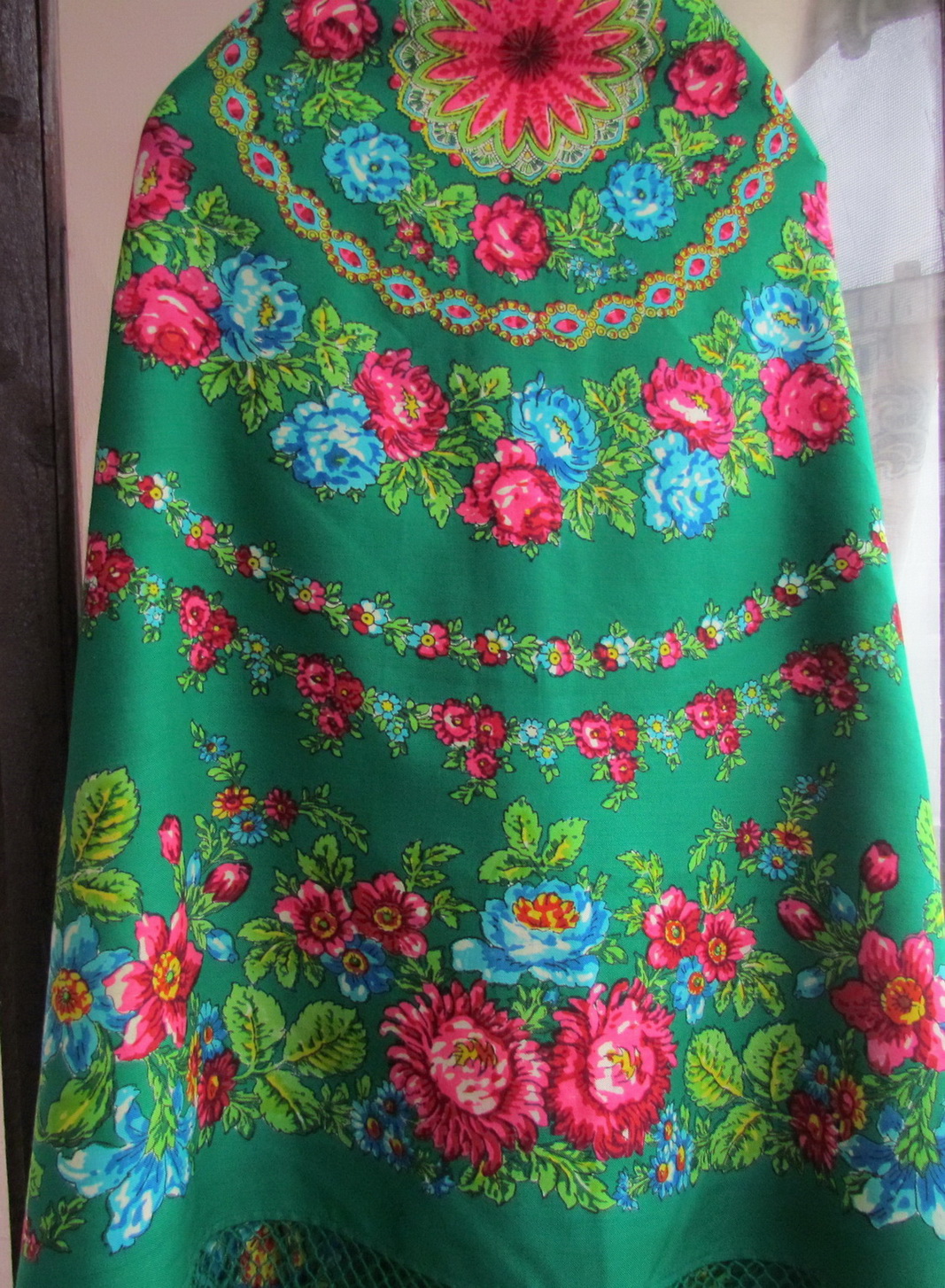 А вот то, что платки раскрывают всю свою красоту, когда их любишь, это вы совершенно верно подметили. Привезла я его в тесном целлофановом пакетике в совершенно замученном виде. Шутка ли - пролежать столько лет! На балконе подышал, расправился (для меня это мальчик) и распустились хризантемки. После утюжки с паром еще краше стал - розы загорелись ярко-красным и розовым родамином. Смотрю и диву даюсь: ну как можно ТАКУЮ красоту от народа скрывать?! А вообще он мне немножко елочку новогоднюю напоминает