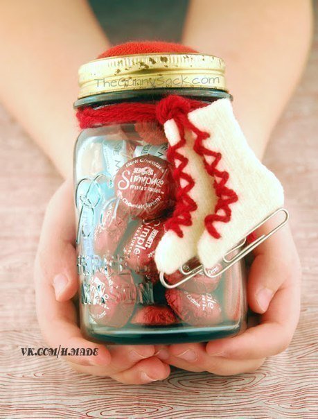 Для начала из мягкой несыпучей ткани (фетр, например) вырезаем заготовку для коньков. Сшиваем ее по типу шнуровки красной ниткой и крепим скрепку вот таким образом. У нас получается пара коньков. А потом начинаем укладывать в банку все наши подарочки. Начните с перчаток, затем шоколад, бальзам и конфеты, закручиваем крышку и готово!