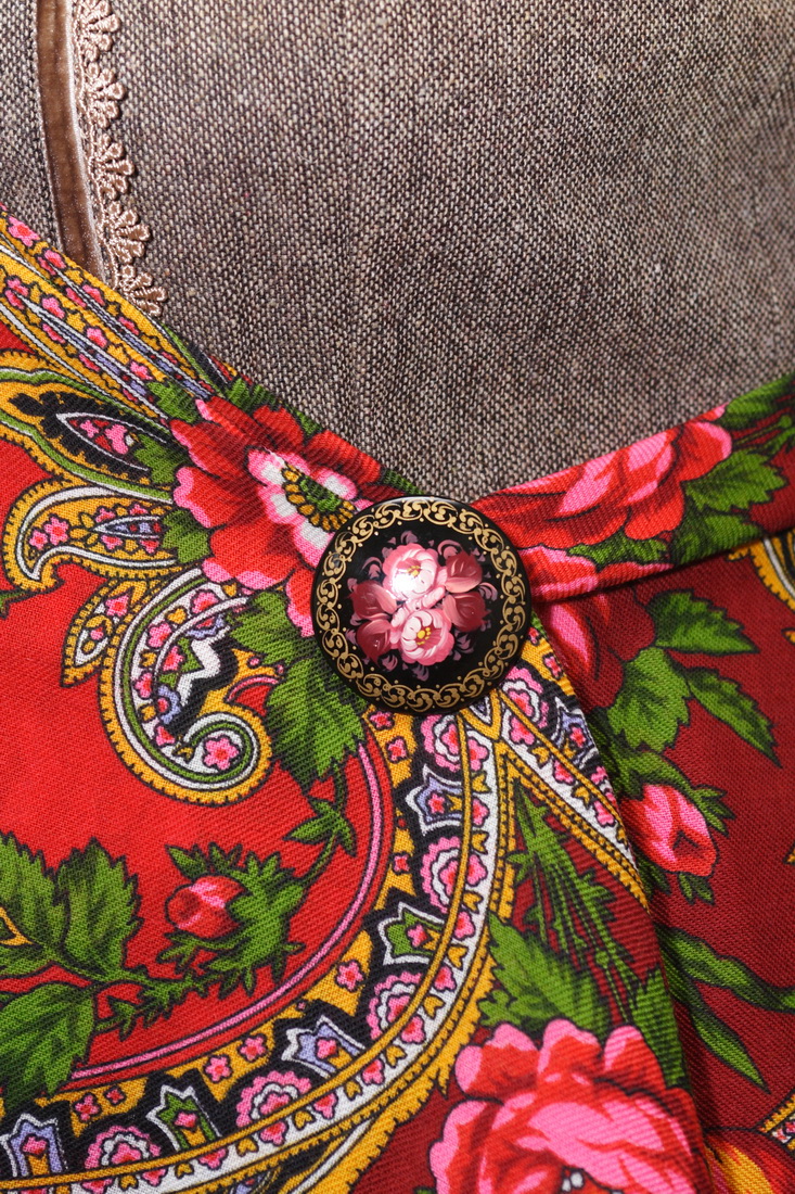 Брошка очень хороша. Платок по цвету подходит, но брошка краше от этого не делается, она просто теряется в сложном затейливом рисунке Звонницы. Рисунок брошки тонок и нежен, это надо подчеркнуть. Значит платок со сложным рисунком, все берущий на себя, сюда не подходит. К ней нужен либо шелк с размытым рисунком. Либо с рисунком на шелке, где большие поля одного цвета, тогда это однородное поле ближе к брошке, рисунок отодвигаем. Если шерсть, то можно что-то, где большая серединка одного цвета, а рисунок по краю поля, тогда рисунок шали окажется вдали от брошки, и спорить они не будут. Это может быть (не говорю сейчас про цвет, а про тип рисунка) Караван, или восстановленный платок с просновками с мелким рисунком по краю. А цвет надо смотреть, может быть светло- болотный под цвет травы внизу или ...(?).