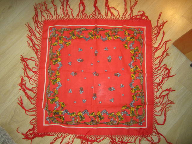 куплен самое позднее в 1992, шерстяной с шерстяной бахромой, размер примерно 76х76.