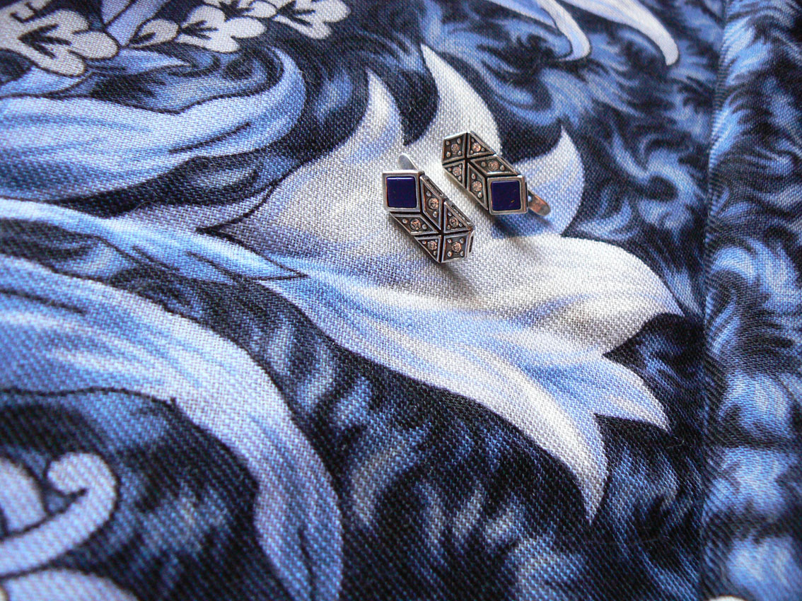 Первое - это браслет в технике финифть. Необычность в том, что выполнен из вольфрама. Такая вот шутка мастера-ювелира. Рядом с ним платок "Над серебряной водой". Очень родственны по цвету и стилю...