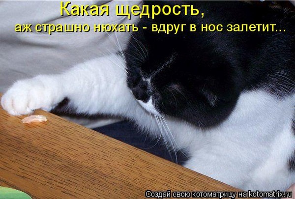 Например, про брызгание в жрущего кота неприятно мокрой водой и кидание в него же металлической баночки с гремящими монетами. По версии специалистов брызги и шум не нравятся котам настолько, что они сразу перевоспитываются. Некоторые аж книксены делать начинают. Но очень важно брызгать и кидать незаметно, чтобы кот не понял, кто пакостит, и не отшлёпал вас укоризненно украденной у вас же куриной лапой.