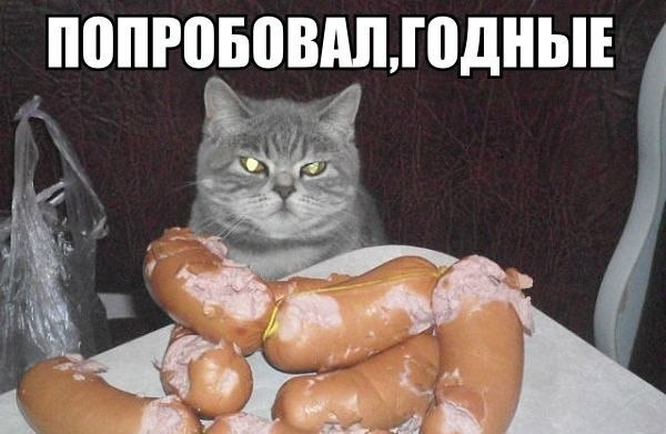 В конце концов всем стало казаться, что кот плотоядно косится на бабушку. А главе семьи — что он работает на еду для кота и успокоительные для остальных. Посоветовались с интернетом. Поисковик на запрос «кот охренел ворует и жрет» сразу выдал фото Борзеля с волочащимися следом шестью метрами чужих сосисок, а ниже — ссылки с советами про борьбу.