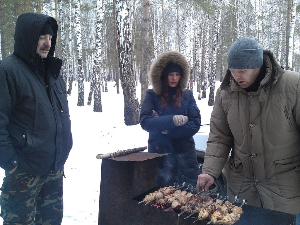 На этой неделе, у нас было очень тепло от 0 до -3 , днем. Ну мы и решили съездить в лес на шашлыки. А так как у зятя только в воскресенье выходной, соответственно выезд на природу был назначен на воскресенье. Вчера замариновала шашлык, нам с дочкой из курочки, мужу и зятю из свининки. Гуляя утром с собакой, убедилась, что в принципе тепло :lol: . Но в лесу оказалось намного холоднее, и пронизывающий ветер. Конечно, в городе то снег убирают, дома закрывают от ветра. А в лесу сугробы, да еще мы приехали на берег озера, в зону отдыха.