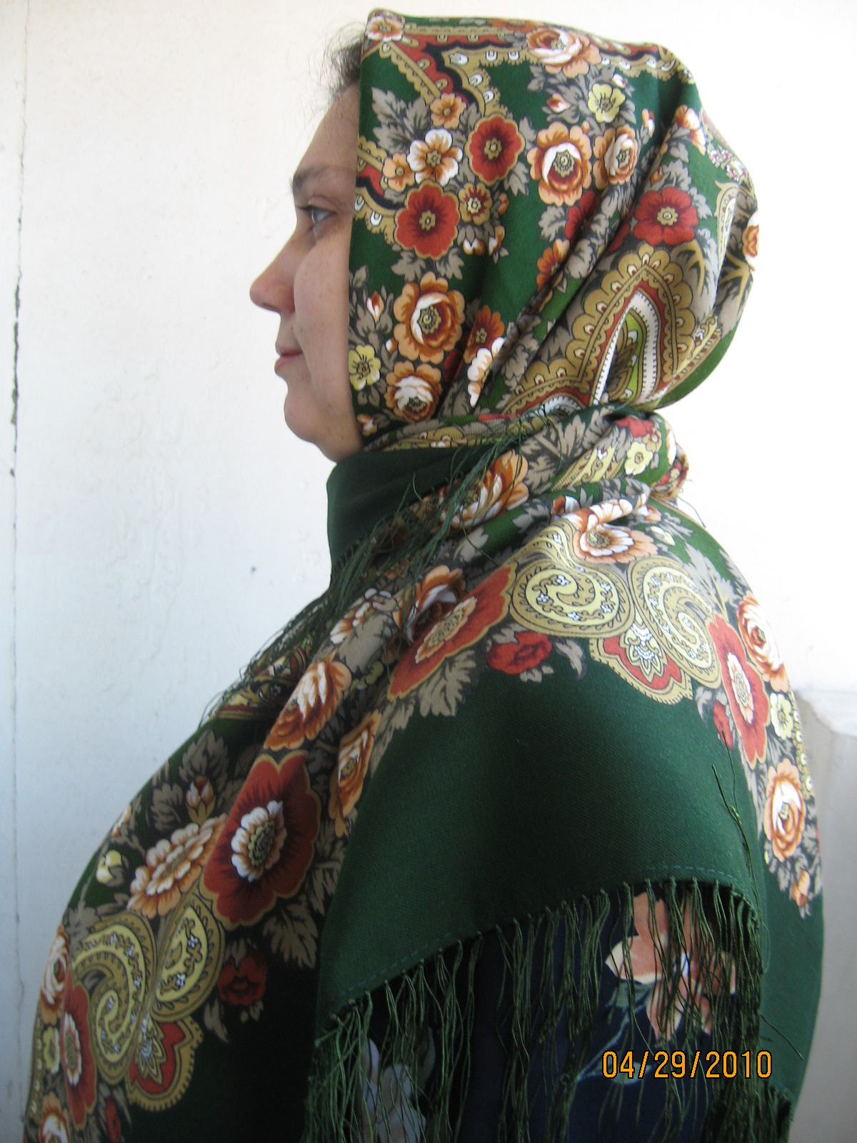 Лето в Павлове-очень яркий платок. Рисунок ложится не плохо, на затылке крупная роза, но поскольку в рисунке много зелени, вся голова получается зеленая с отдельными красными цветами. Осталось чтобы эта "гремучая смесь" помирилась с одеждой :P