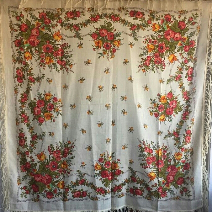 У меня есть такая, но на черном фоне. Она просто огромная, размер 155х155 и бахрома 35 см. Но очень пластичная, отлично драпируется. Ссылка по-прежнему находится в размере 125 неопознанных, так как по-мнению модератор(а)ов данная шаль не павловопосадская.