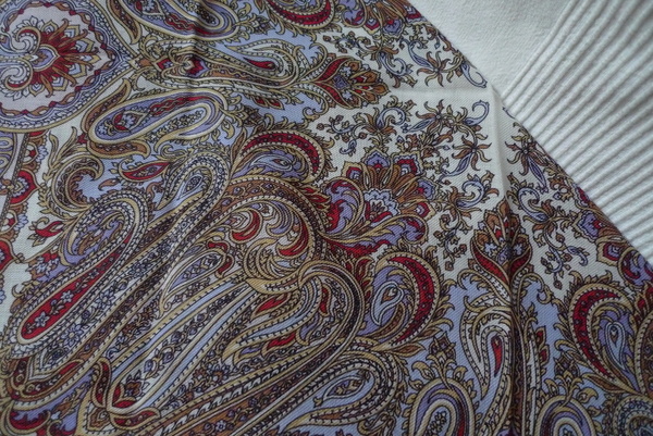 Итого - практически идеал. Да еще рисунки и колорит! Розы-цветы мне не идут, неоднократно проверено под придирчивым взглядом подруг и собственным придирчивым взглядом в зеркало, а вот такие узоры, более "европейские", мои. Ну и цветовая гамма бело-голубых "Гуляний" идеальна для цветотипа "Лето". Черные, как ни странно, тоже идут, хотя их надо более тщательно повязывать. В общем, я рада. И причем размер не настолько маленький, чтобы под подбородком оставался только краешек платка, нет. Не маленький - и не большой.