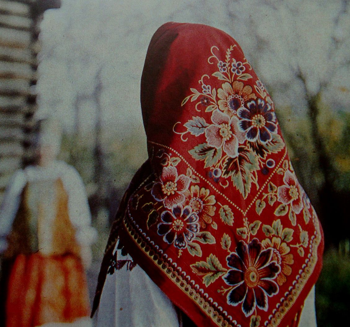 На первом платке с огурцами черная середина не подвернута, а уложена на голову, как будто так положено было носить...