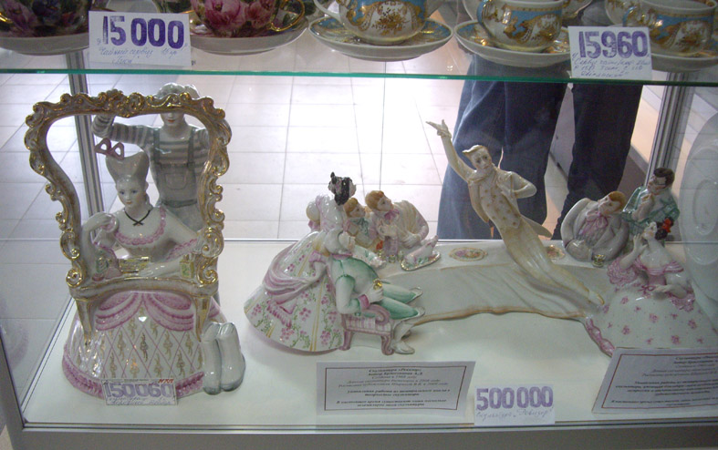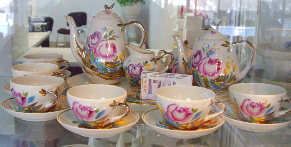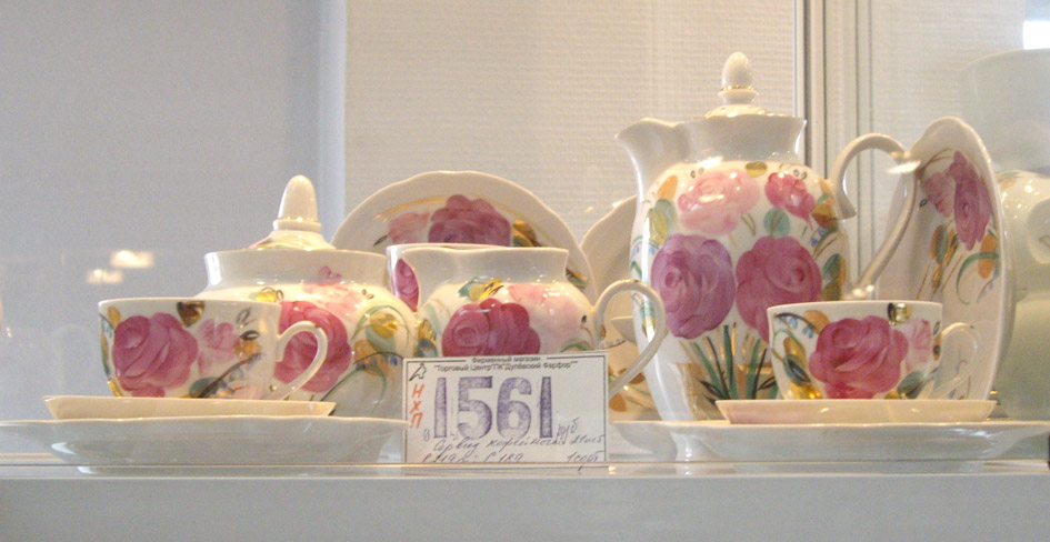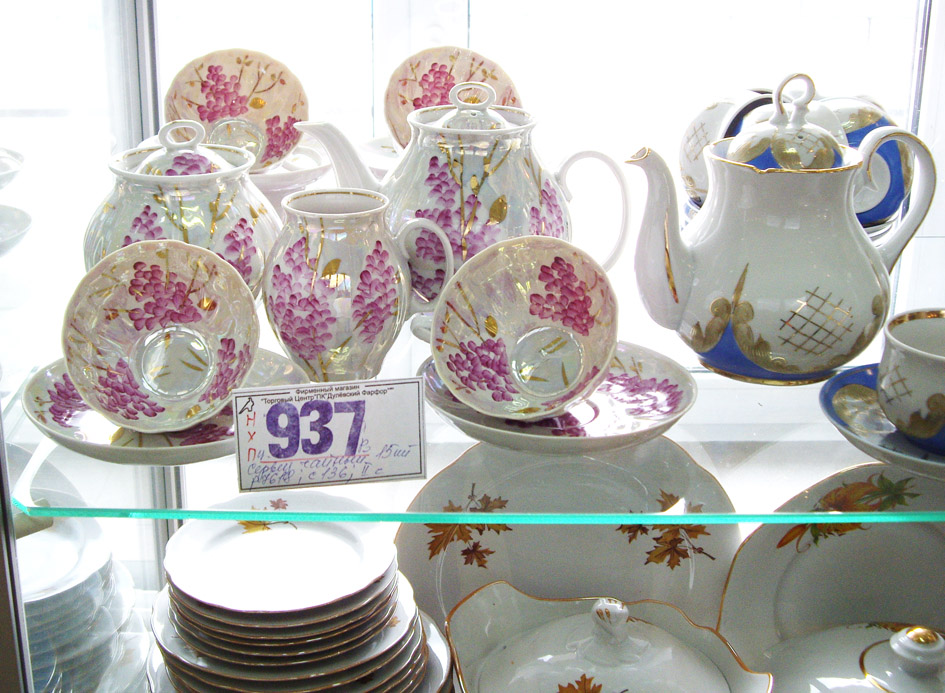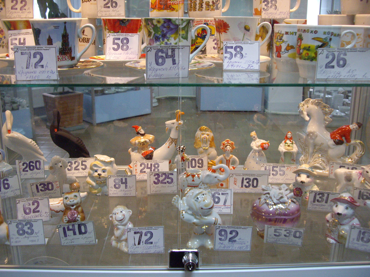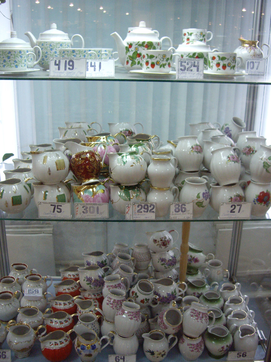 Надо добавить, что знаменитых “агашек” в магазине всего процентов 20-30 от прочего изобилия. Прочее - это масса сервизов, наборов и наборчиков, оформленных механическим способом “деколем” (что-то вроде переводных картинок), иногда с добавлением прорисованных золотом ободков. Есть чисто белая посуда для кафе и ресторанов, так называемое “белье” и посудный ряд для микроволновок. Цены раза в три дешевле московских. Хотя, в Москве тоже где-то есть фирменный магазин, там наценка всего 50%.