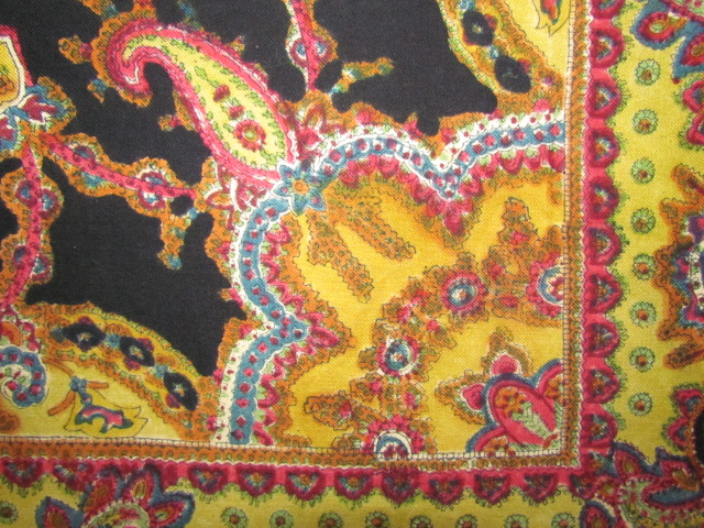 Здравствуйте, уважаемые Знатоки Шалей! Ко мне попал странный платок. Размер 150х150. Бахрома шерстяная, клетками. Печать нечеткая, как будто дорисована вручную, но рисунок очень интересный. Что это может быть такое?