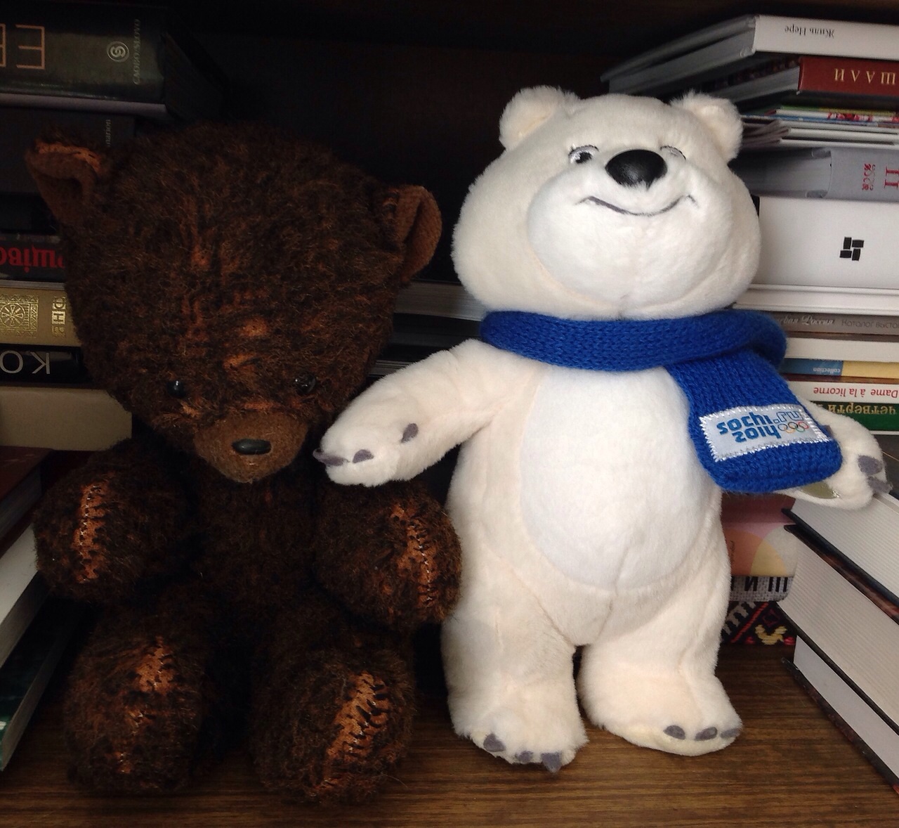 один житель прошлого века ,другой этого.Какие они разные -и мастью ...Старенький мишка ,,тронут временем,,и такой Норштейневский. Олимпийский мишка - исторический символ .Да...время идет...Мишка-дедушка и Мишка-внучек.