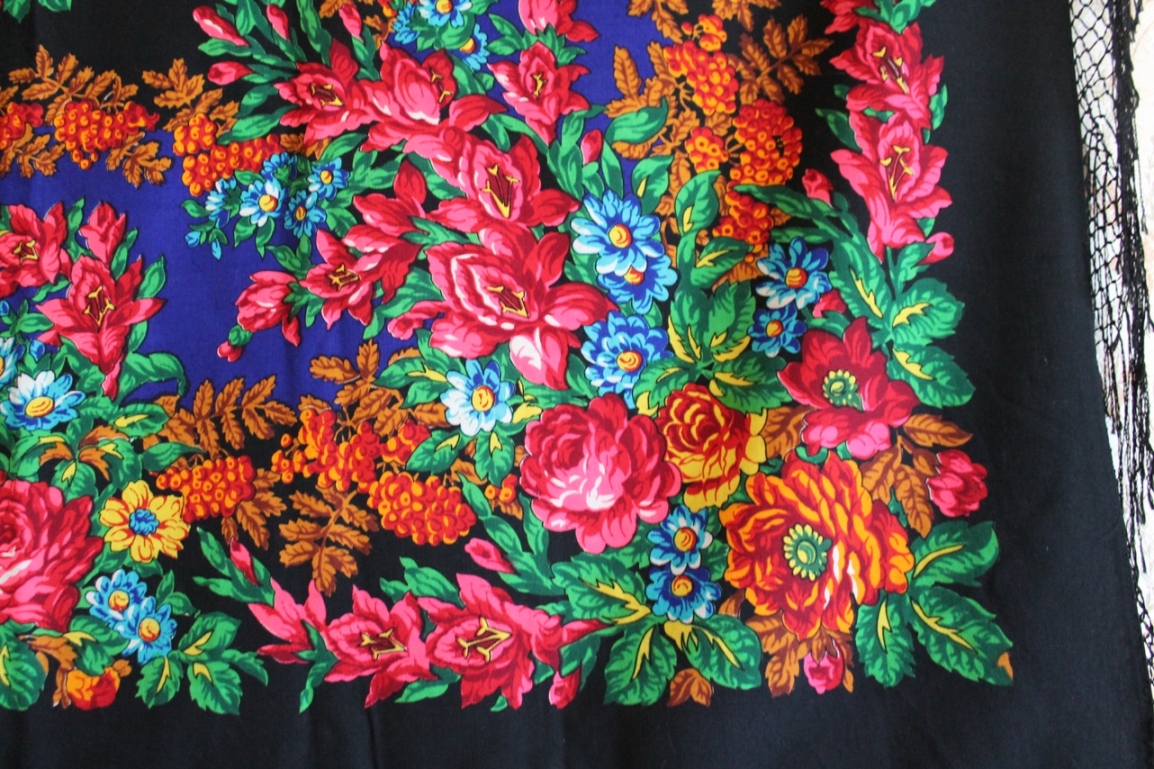 Приключилась со мной история сегодня... Пошли с утра гулять со старшей собакой .Возле дома у нас остановка, а возле остановки-стихийный рыночек. Все окрестные бабули приносят свои соленья-варенья зимой, грибы-ягоды летом, и торгуют. Сегодня. всё , как всегда-бабули, банки с грибами и капустой. А у одной женщины на ручку сумки на колёсах как-то стыдливо и неуверенно была накинута шаль. Шаль как будто стеснялась, что она вынуждена соседствовать с банками и тыквами. Бабуля при шали тоже чувствовала себя неуверенно. Мы прошли туда и вернулись обратно.Да, шаль продавали. Ну, мы с собакой сбегали за деньгами и принесли её домой. Потом стала уже рассматривать и идентифицировать свое приобретение.Оказался Аккорд неизвестного колорита( у нас в базе такого нет). Шаль без этикетки , поэтому колорит не знаю. Шаль в отличном состоянии, ни дырочек, ни потёртостей,очень яркая и чёткая печать. Куплена в 80-х годах.
