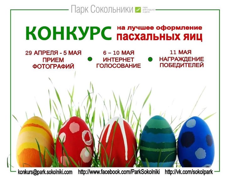 В рамках II ежегодногой экологического марафона "Укоренись в парке" Сокольники 11-12 мая, проводится конкурс на лучшее оформление пасхального яйца, проведение которого совпадает с праздником Пасхи.